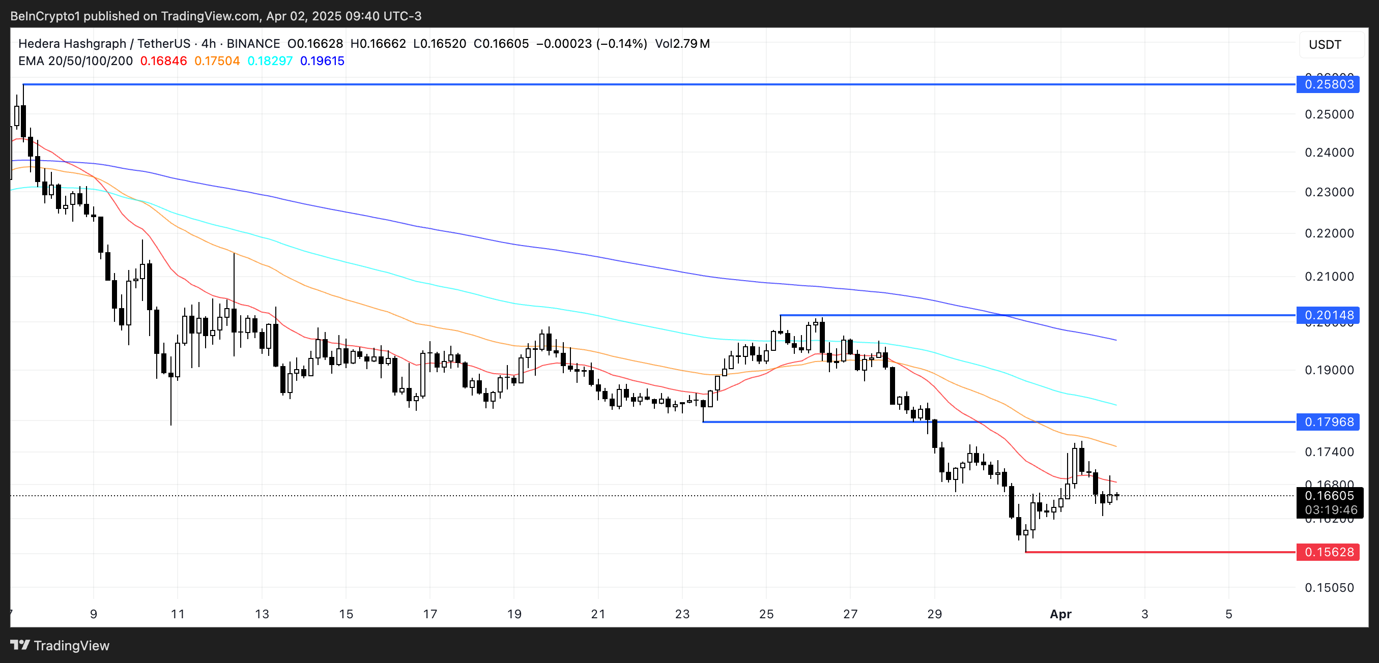 Indikator EMA Hedera terus mencerminkan tren bearish, dengan moving average jangka pendek berada di bawah yang jangka panjang.