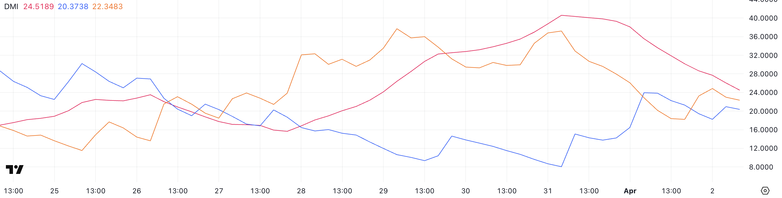Grafik DMI Hedera menunjukkan penurunan signifikan dalam Average Directional Index (ADX), saat ini di 24,5—turun tajam dari 40,5 hanya dua hari lalu.