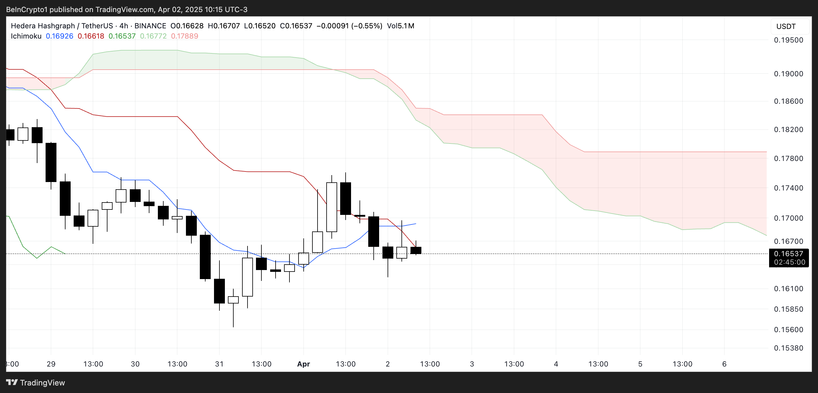 Grafik Ichimoku Cloud untuk Hedera menunjukkan setup yang jelas bearish. Aksi harga tetap di bawah cloud (Kumo), yang diarsir merah—tanda bahwa momentum bearish masih mendominasi.