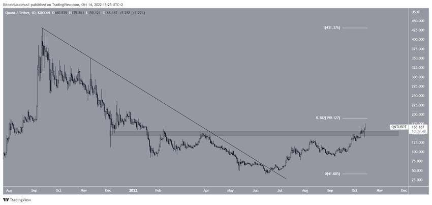 Ketika 19 Juni lalu, harga Quant (QNT) bergerak keluar (breakout) dari garis descending resistance. Garis tersebut sudah tercipta dari sejak rekor all-time high QNT sebelumnya. Breakout dari struktur jangka panjang seperti demikian biasanya merupakan awal dari pergerakan naik yang signifikan. Kemudian, di tanggal 14 Oktober, QNT berhasil mencapai level tertingginya tahun ini, yaitu di US$176,30. Level itu terbentuk di atas titik US$145 yang merupakan area horizontal, sekaligus tepat berada di bawah level Fib retracement resistance 0.382, yaitu US$190. Kini, area US$145 dianggap sebagai support, sedangkan US$190 kemungkinan akan bertindak sebagai resistance.