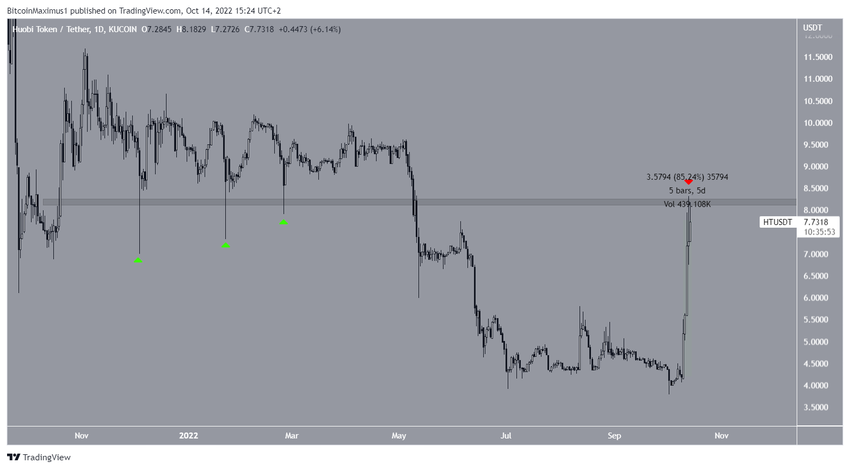 Harga Huobi Token (HT) mulai mengalami kenaikan signifikan pada tanggal 9 Oktober lalu. Dalam kurun 5 hari saja, HT sukses mencatatkan kenaikan sebanyak 85%. Alhasil, HT pun berhasil mencapai level US$8,20. Sayangnya, harga Huobi Token terpental dari area resistance horizontal di titik US$8,10 dan menciptakan sumbu atas (upper wick) yang panjang. Apabila HT belum sanggup menembus area tersebut, maka trennya tidak bisa dianggap bullish. Namun, jika HT berhasil bergerak di atas area itu, maka akan mempercepat tingkat kenaikannya nanti.