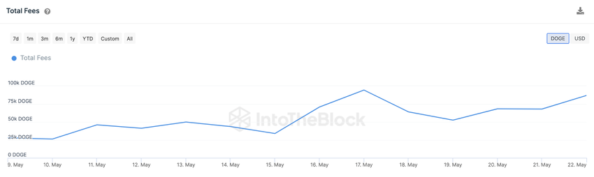 Antara tanggal 10 Mei dan 22 Mei, biaya transaksi rata-rata di jaringan Dogecoin meningkat tiga kali lipat.