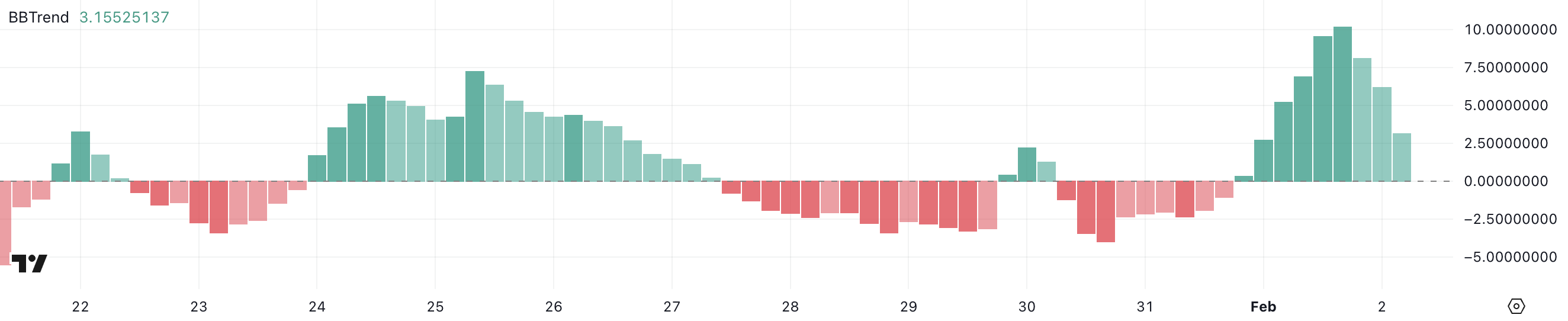 SponsoredSemakin tinggi nilai BBTrend, semakin kuat tren ke arah tersebut. Meskipun BBTrend HYPE tetap positif, penurunan tajamnya menunjukkan bahwa tekanan beli mulai memudar.