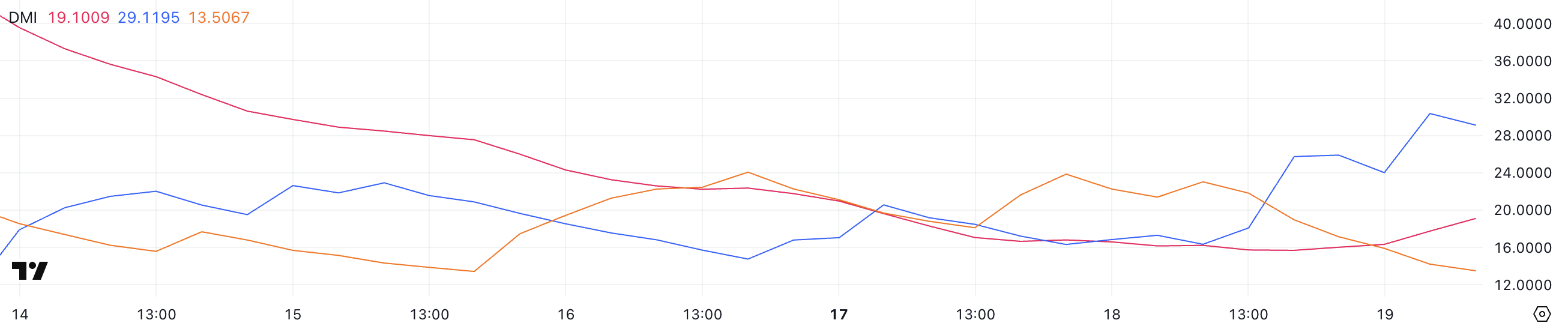 Grafik Directional Movement Index (DMI) HYPE mengindikasikan perubahan momentum yang menjanjikan. ADX (Average Directional Index) naik dari 15,7 menjadi 19, yang menandakan tren mulai menguat.