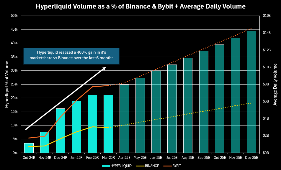 “Jika Hyperliquid dapat mempertahankan hanya sebagian dari tingkat pertumbuhannya, kita bisa melihatnya mencapai ~20% dari volume Binance pada akhir tahun,” tulis postingan tersebut.