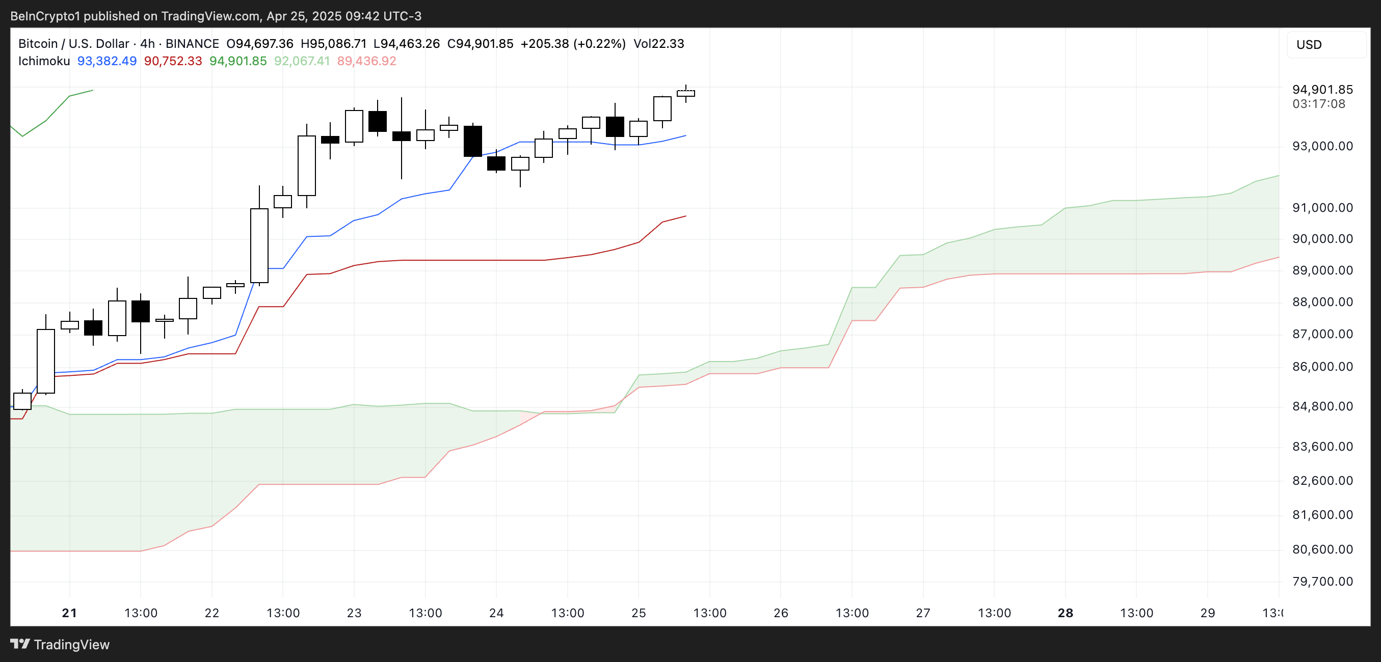 Grafik Ichimoku Cloud Bitcoin menunjukkan tanda-tanda momentum bullish yang berlanjut.