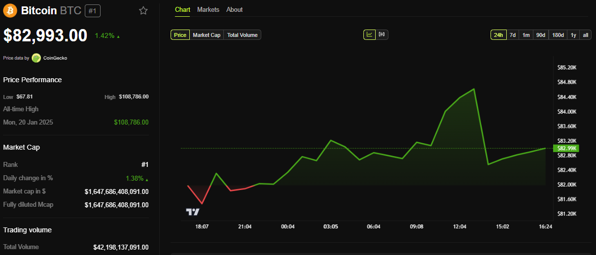 Data BeInCrypto menunjukkan Bitcoin diperdagangkan seharga US$82.993 pada saat ini, naik sebesar 1,42% dalam 24 jam terakhir.