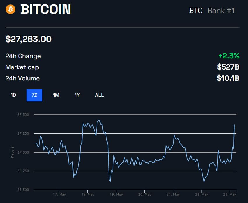 Namun, volatilitas tersebut belum terjadi lantaran BTC masih berkonsolidasi. Sang raja kripto ini telah naik 2,3% pada hari itu menjadi US$27.283 saat publikasi.