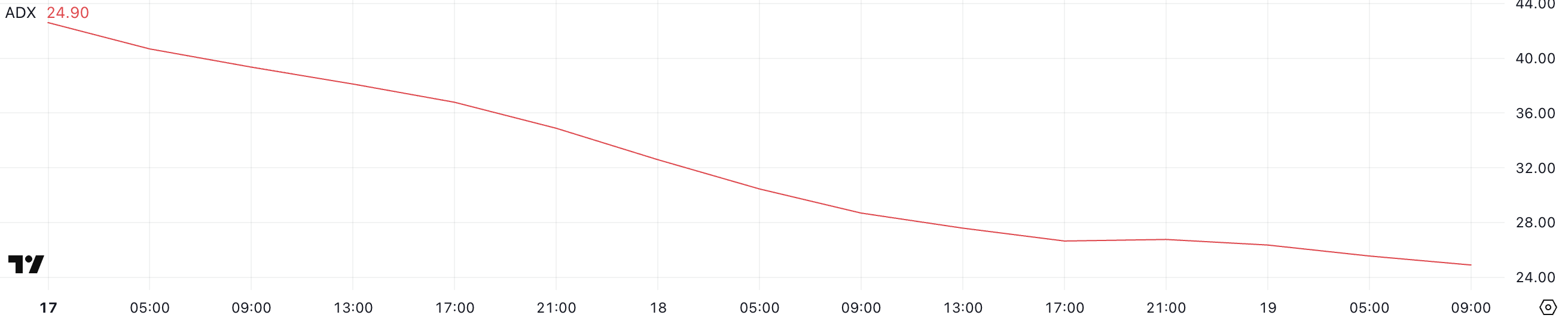 Sebelumnya, dengan ADX di 42,6, pasar mengalami pergerakan arah yang kuat, namun penurunan ke level saat ini menunjukkan bahwa momentum di balik tren tersebut memudar.