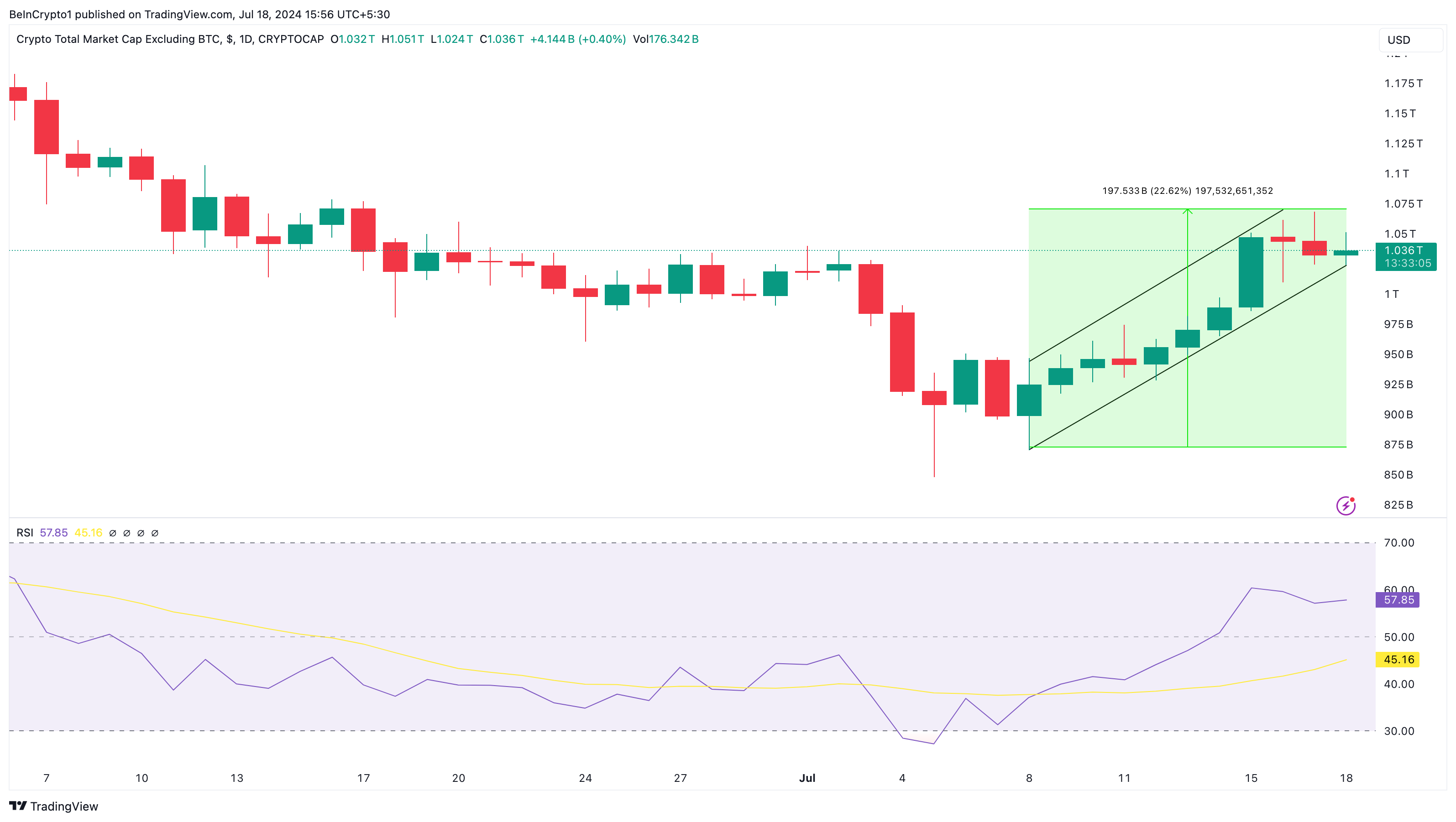 Namun, jika nilainya turun, BTC bakal mengungguli rata-rata altcoin. Seperti yang terlihat pada grafik di bawah ini, kapitalisasi pasar dari top 125 aset kripto meningkat dari US$873,11 miliar menjadi US$1,07 triliun selama periode tanggal 8 Juli – 17 Juli.