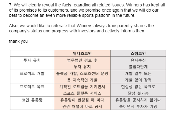Menanggapi peristiwa ini, dalam laman resminya, Winnerz mengeklaim bahwa sejauh ini, perusahaan sudah mengungkapkan tujuan bisnis dan pengembangannya sesuai jadwal. Selain itu, mereka juga mengeklaim setiap fakta investasi yang dibuat adalah akurat dan diungkapkan secara jujur, tanpa kebohongan.