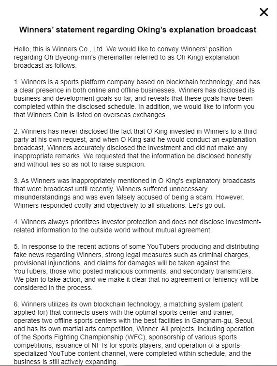 Sementara itu, pesohor media sosial lainnya, Oh Byeong-min atau yang dikenal dengan nama Oking, mengaku bahwa dia telah melakukan investasi di platform tersebut. Namun, dia juga menegaskan bahwa pihaknya akan menghentikan seluruh proyek dengan Winnerz dan menyetop kolaborasi di masa mendatang.