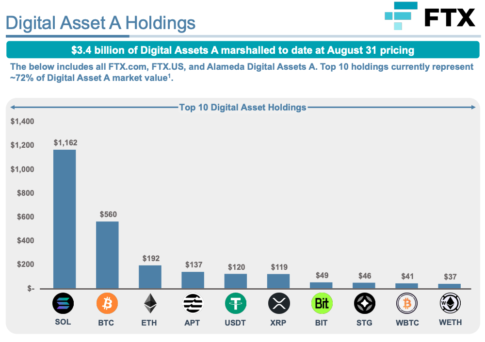 FTX memiliki berbagai aset kripto yang mencapai sekitar US$3,4 miliar per 31 Agustus 2023. Terdapat 10 aset kripto teratas yang mewakili sekitar 72% dari total nilai aset kripto yang dimiliki FTX. Berikut adalah rinciannya: