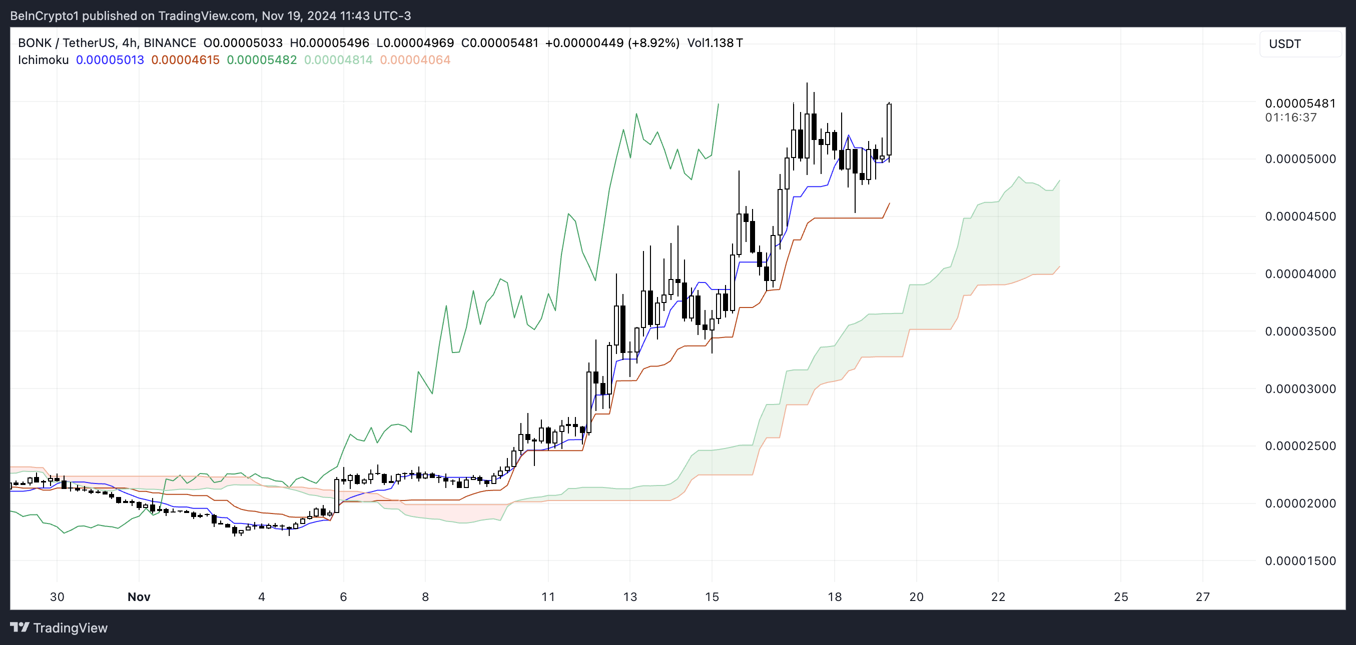 Jika tren naik berlanjut, BONK bisa terus menguji level yang lebih tinggi karena awan memproyeksikan dukungan lebih lanjut ke depan. Struktur bullish tetap utuh, karena tidak ada tanda-tanda pelemahan momentum yang signifikan.