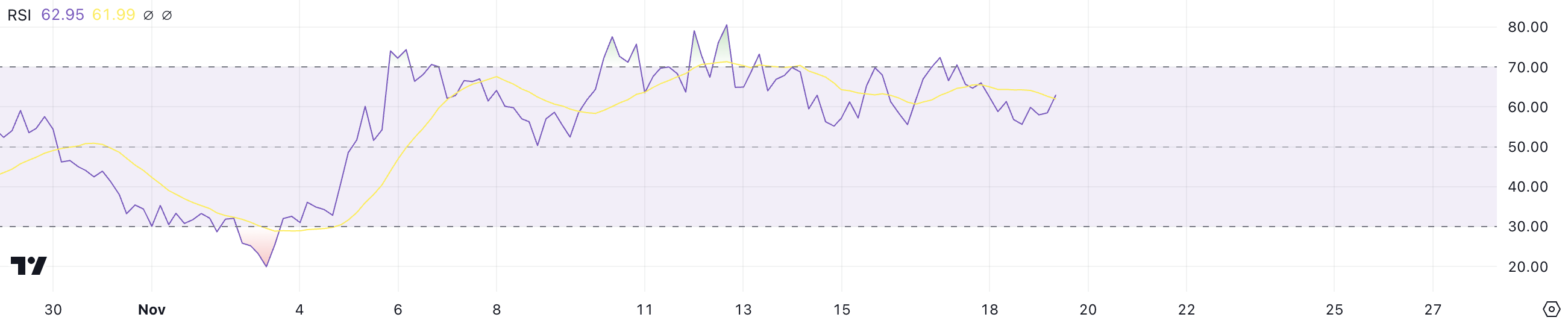 Indeks Kekuatan Relatif (RSI) melacak momentum harga, dengan pembacaan di atas 70 menunjukkan kondisi overbought dan di bawah 30 menandakan level oversold. Dengan 62,95, BONK masih berada di wilayah bullish namun memiliki ruang untuk tumbuh sebelum mencapai status overbought.