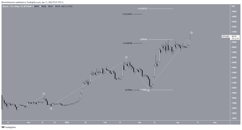 Prospek pertama, harga Bitcoin (BTC) saat ini sedang berada di dalam gelombang kelima dan terakhir dari pola bullish impulse (putih). Gelombang lima ini telah diperpanjang dan telah bergerak di atas panjang gelombang satu dan tiga (putih) serta Fib eksternal 1.61 dari gelombang empat (hitam). Oleh karena itu, target harga Bitcoin berikutnya kemungkinan ada di kisaran antara US$34.500 hingga US$35.500.