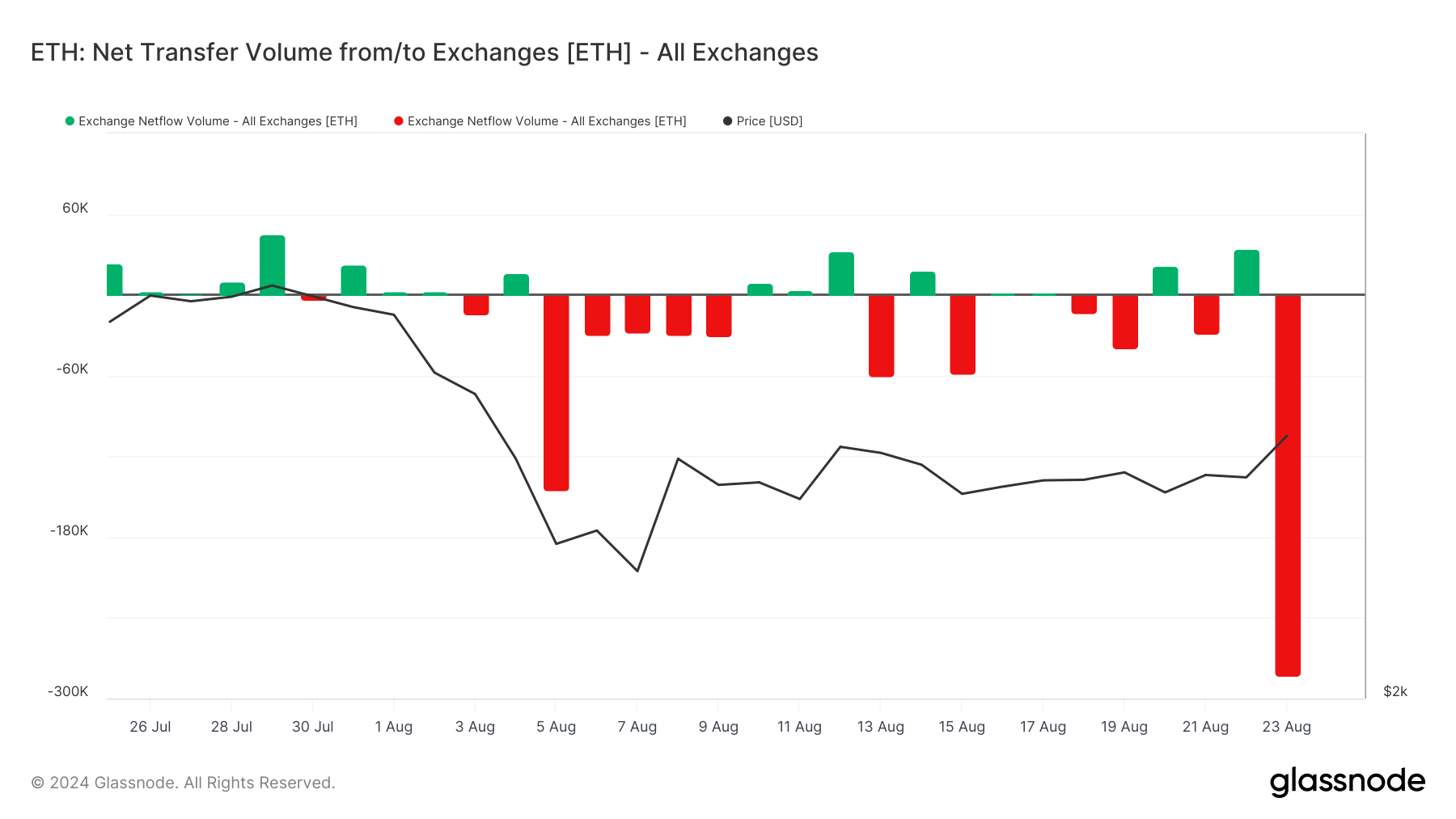 Di samping itu, Ethereum juga membukukan lonjakan penarikan dari crypto exchange. Merujuk pada data Glassnode, volume transfer bersih di crypto exchange mengukir penurunan signifikan lebih dari 280.000 ETH per 23 Agustus.