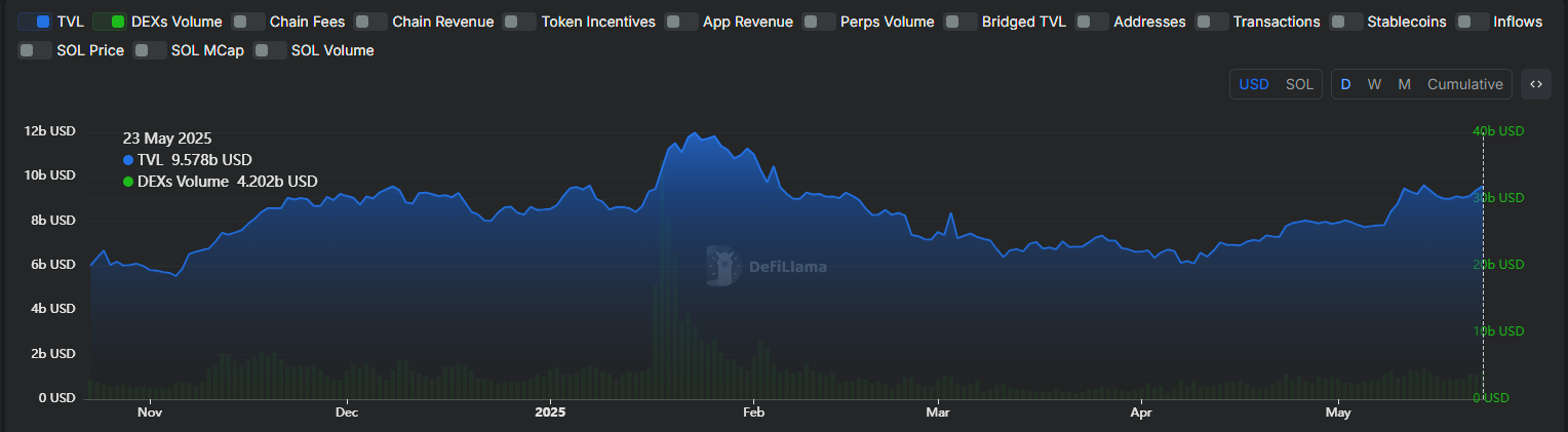 Misalnya, meme coin menyumbang hampir 65% dari volume perdagangan Solana pada bulan Mei. Pada puncaknya, perputaran harian DEX melampaui US$45 miliar. Namun, jalur deposit ke platform prediksi menambah utilitas baru.