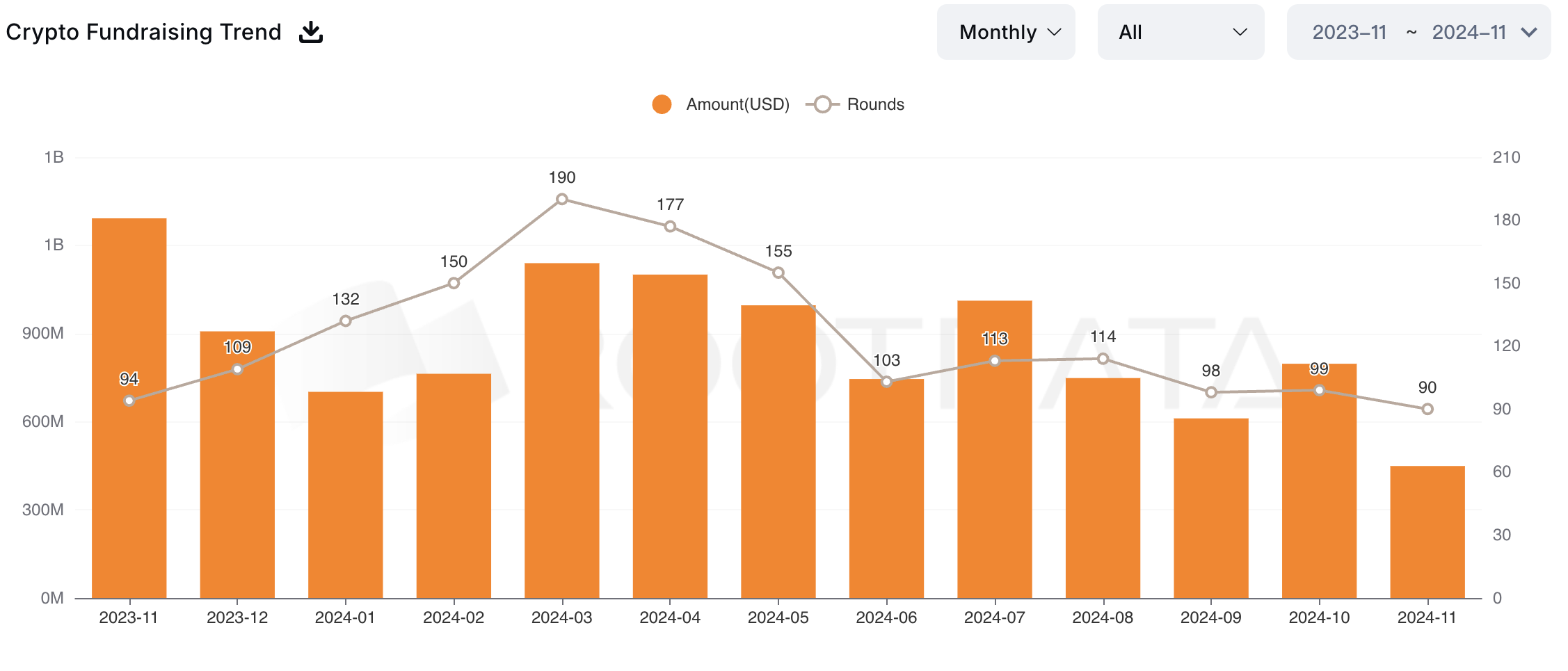 Menurut statistik RootData, investasi venture capital (VC) di ruang kripto turun 9% dari Oktober, menjadi 90 investasi dari bulan sebelumnya yang mencapai 99 putaran.