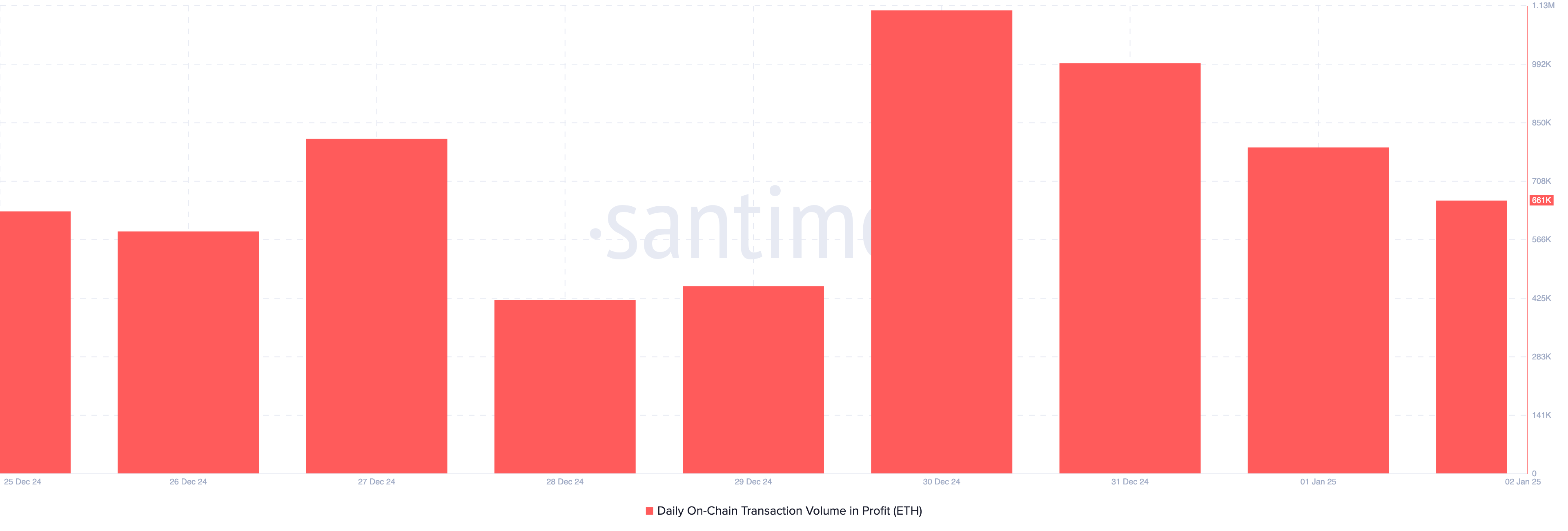 Meski ada optimisme dan kenaikan harga baru-baru ini, volume on-chain dalam profit telah menurun. Pada hari terakhir tahun 2024, volume transaksi dalam profit adalah 995.000 ETH. Hari ini, telah menurun menjadi 661 ETH.