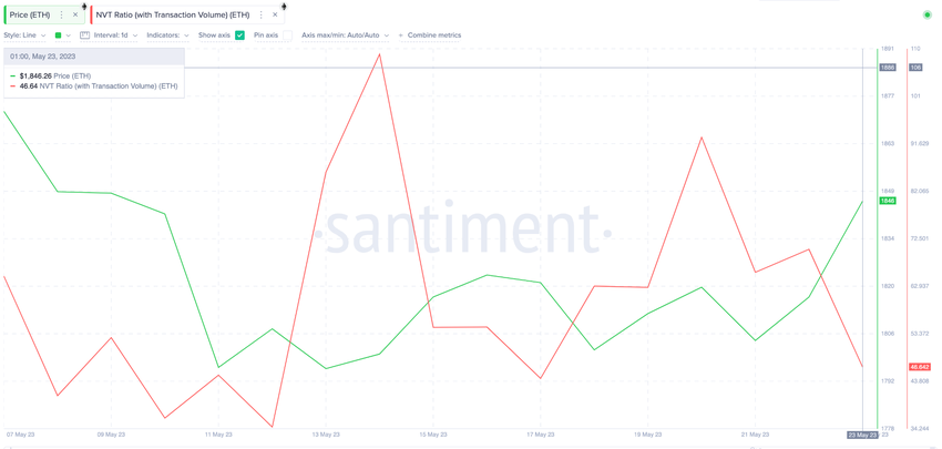 Selain itu, penurunan rasio Network Value to Transaction Volume (NVT) ETH mengungkapkan bahwa saat ini nilainya masih terlalu rendah (undervalued). Grafik di bawah ini menunjukkan bagaimana rasio NVT Ethereum turun 49% dari 92,92 menjadi 46,64 antara tanggal 20 Mei dan 22 Mei.