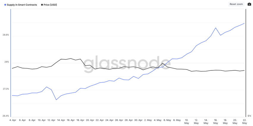 Metrik Pasokan dalam Smart Contract (Supply in Smart Contract) melacak persentase sirkulasi pasokan aset kripto yang sudah dikunci oleh investor dalam berbagai protokol staking. Ketika persentase ini meningkat, hal itu bisa menyebabkan penurunan sementara dalam pasokan di pasar.