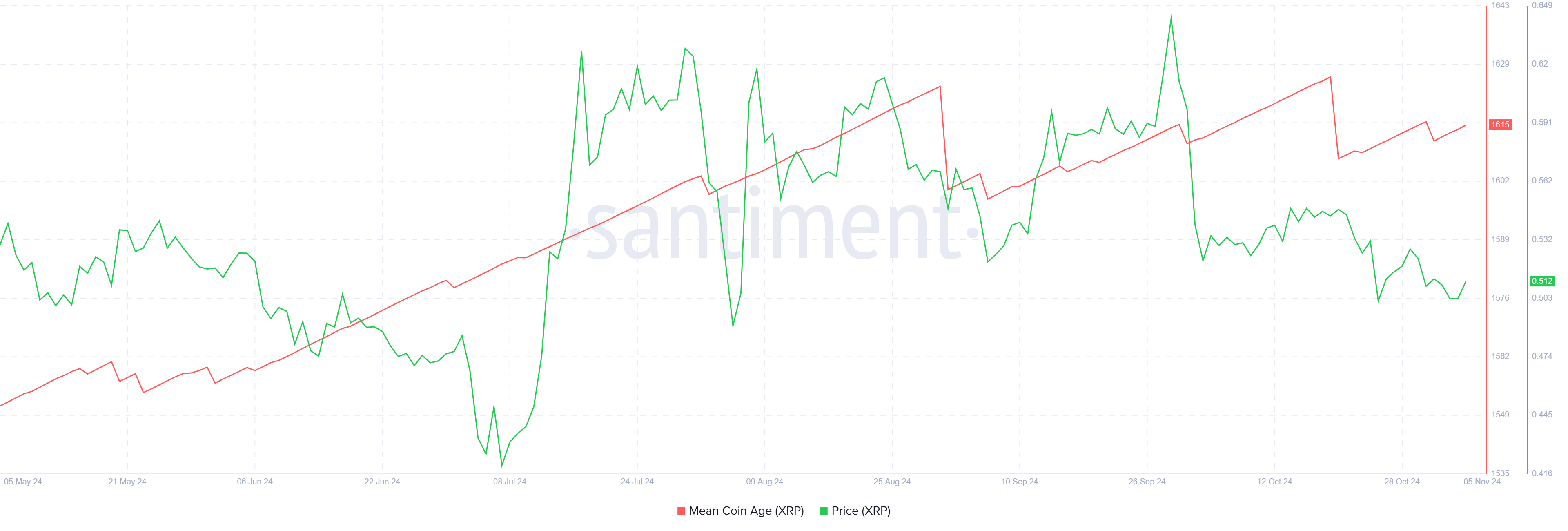 Rasio Mean Coin Age (MCA) XRP telah mengalami penurunan berkala sejak Agustus, menunjukkan keraguan di antara holder jangka panjang (LTHs). LTHs sering memainkan peran penting dalam menjaga stabilitas harga aset. Penurunan terbaru mencerminkan rasa hati-hati, mengisyaratkan bahwa holder ini mungkin sedang mengevaluasi kembali posisi mereka.