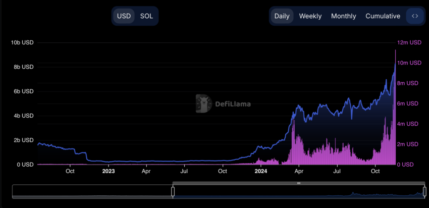 Ekosistem Solana menjadi pusat dari euforia ini. Dalam 24 jam terakhir, decentralized application (dApp) Solana mencatatkan US$11,08 juta dalam biaya transaksi dan US$4,03 juta dalam pendapatan, menurut DeFiLlama. Angka ini hampir dua kali lipat dari yang tercatat pekan lalu.