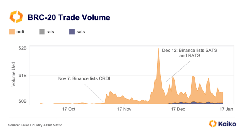 Menurut para analis di Kaiko, volume perdagangan token-token BRC-20 telah meroket sejak November 2023, menunjukkan posisi unik mereka di pasar kripto.