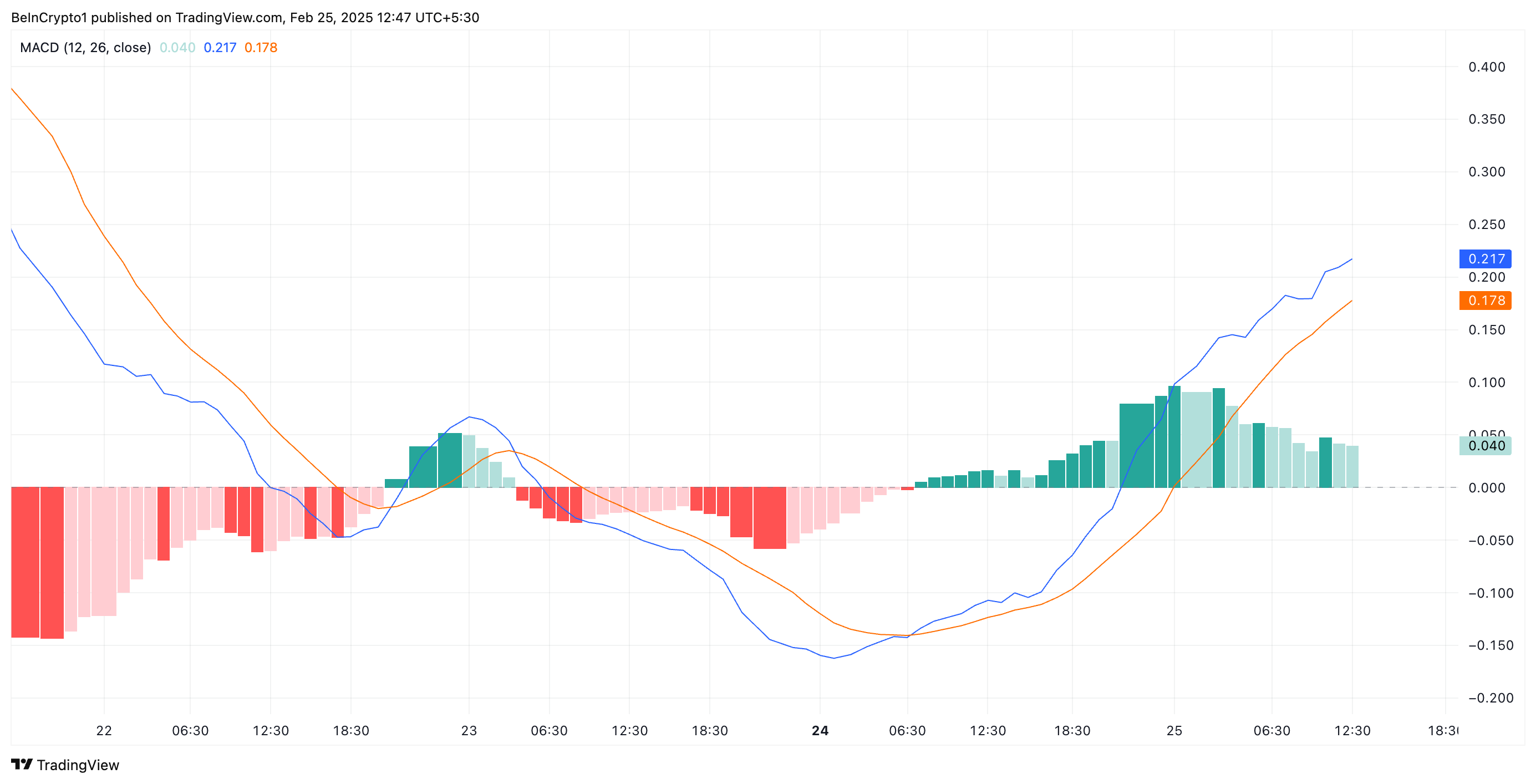 Pengaturan Moving Average Convergence Divergence (MACD) mengonfirmasi kemungkinan breakout bullish ini. Pada saat publikasi, garis MACD IP (biru) berada di atas garis sinyalnya (oranye).