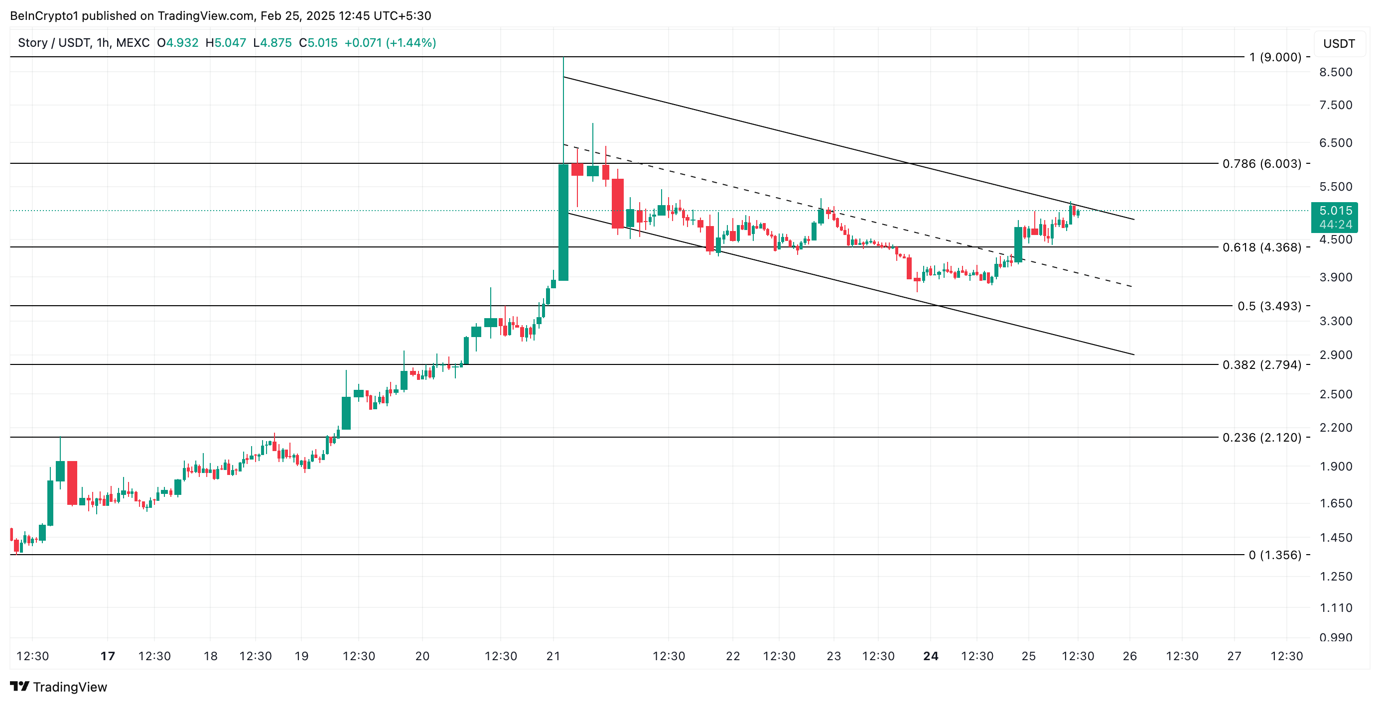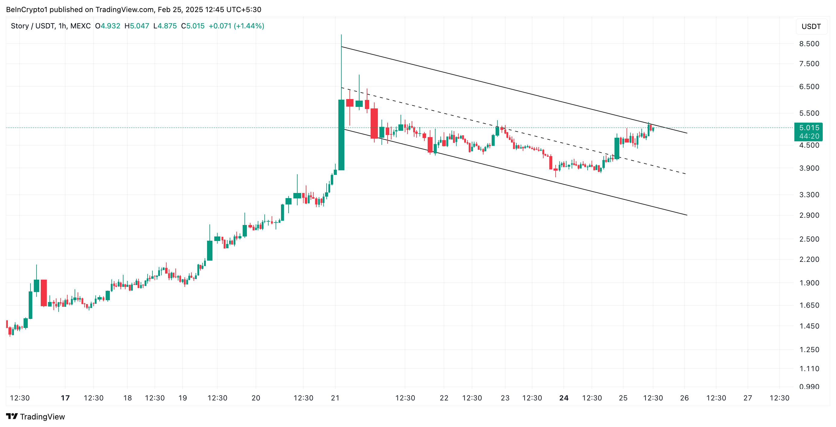 Story (IP) telah melonjak hampir 25% dalam 24 jam terakhir, menjadikannya aset dengan performa terbaik di pasar. Reli dua digit ini telah mendorong IP ke garis tren atas dari channel paralel menurun.