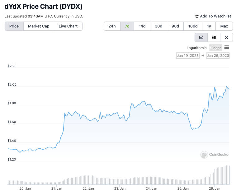 Berkat kabar ini, harga token DYDX mengalami kenaikan yang cukup impresif. Berdasarkan data CoinGecko, harga token DYDX saat ini telah naik sekitar 54,4% dalam 7 hari terakhir; naik sekitar 27,4% dalam 24 jam terakhir; dan naik sekitar 0,5% dalam 1 jam terakhir. Bila dibedah lebih jauh, harga token dYdX sejak akhir Desember 2022 hingga hari Rabu (25/1) telah naik sekitar 75,45%.