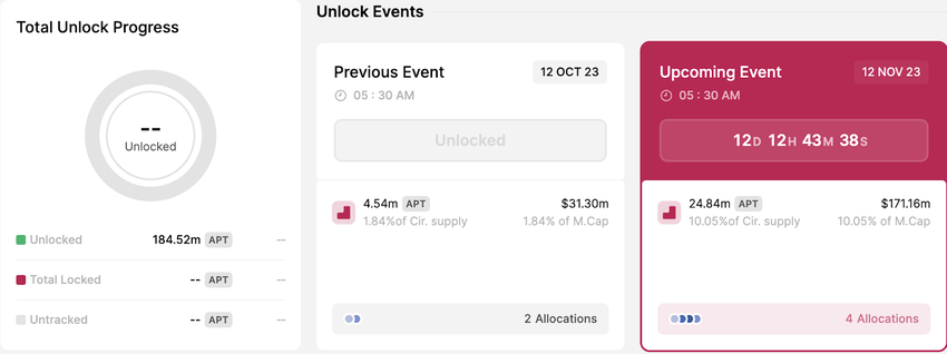 Berdasarkan data saat ini, Aptos (APT) akan memiliki jumlah unlock token terbesar di antara semua token yang siap menggelar unlock yang dijadwalkan untuk bulan November. Hal ini karena proyek blockchain layer-1 ini akan melangsungkan unlock untuk native token mereka yang mencakup sekitar 10,05% dari total pasokan yang beredar.