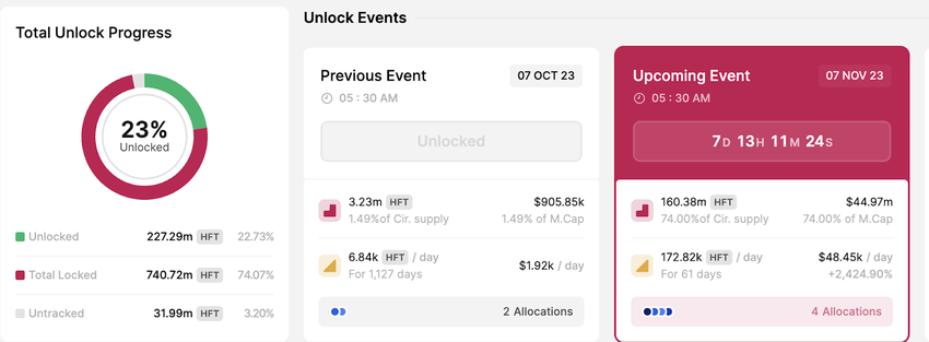Tangkapan layar di bawah ini menunjukkan bahwa Hashflow (HFT) akan melepaskan 74% dari pasokan yang beredar pada 7 November. Proyek ini akan melakukan unlock pada 160,38 juta token senilai US$44,97 juta untuk sejumlah pihak penerima manfaat (beneficiary) berikut ini: