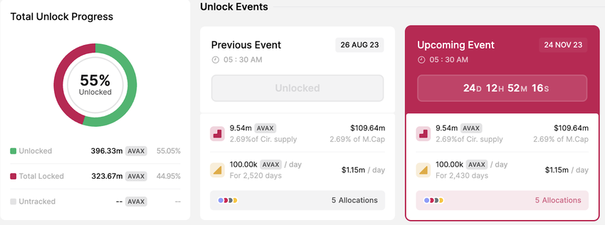Sementara itu, proyek layer-1 (L1) Avalanche siap merilis 9,54 juta koin AVAX senilai US$109,64 juta pada 24 November mendatang. Jumlah token yang masuk ke dalam jadwal unlock ini merupakan 2,69% dari total pasokan yang beredar.
