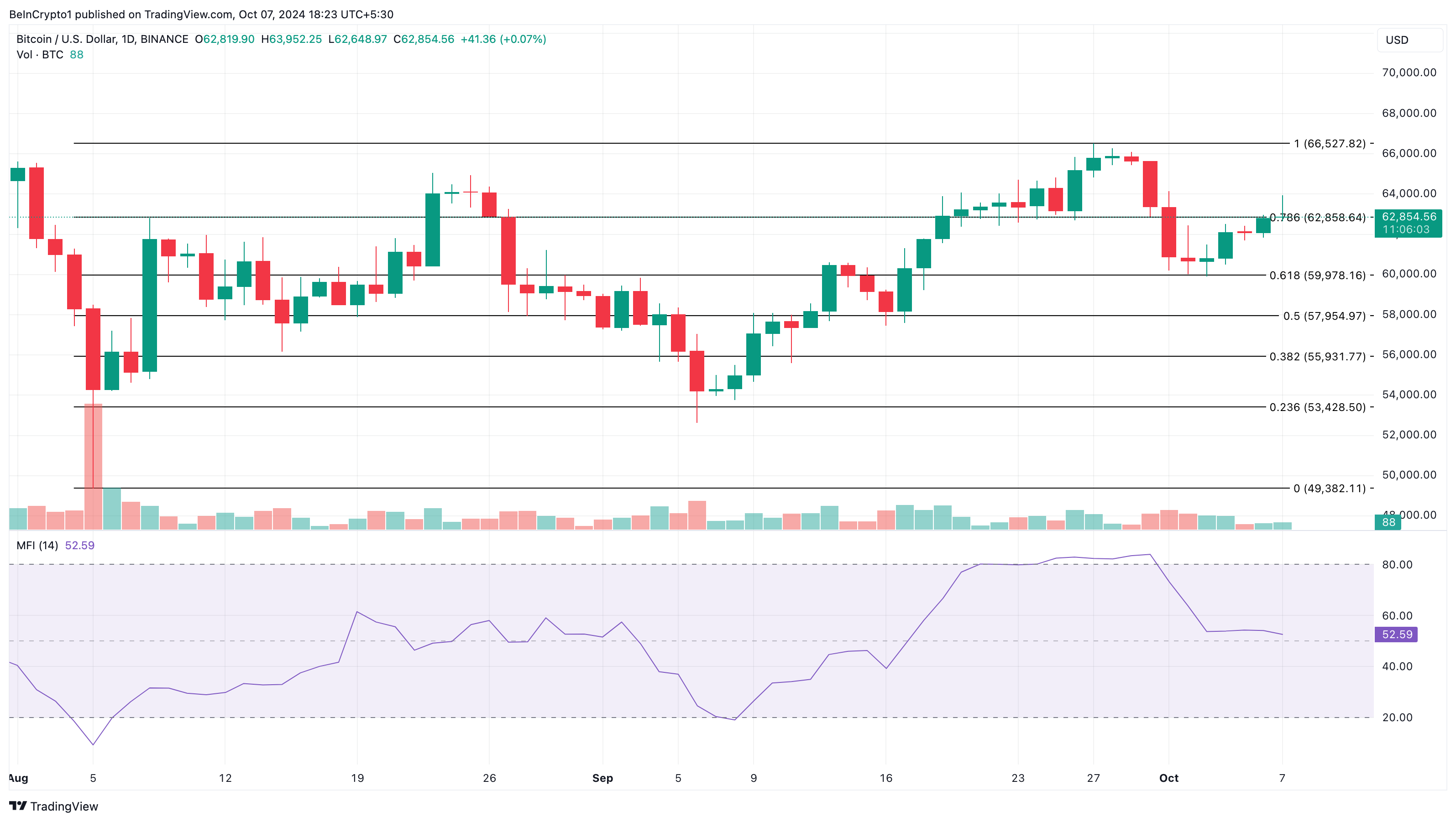 Pada grafik harian, harga Bitcoin saat ini berada di US$62.856, menguat sejak 24 jam yang lalu. Namun, Money Flow Index (MFI) memberi tahu arus modal yang masuk ke aset ini telah melandai.
