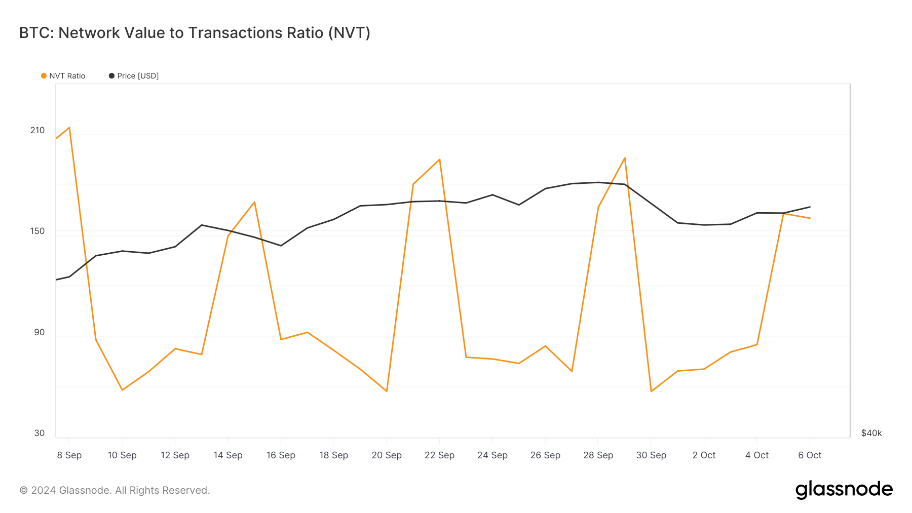 Salah satu metrik penting yang mendukung potensi penurunan harga Bitcoin yakni rasio Network Value to Transactions (NVT). Rasio NVT menunjukkan apakah kapitalisasi pasar tumbuh lebih cepat daripada volume transaksi suatu aset kripto.