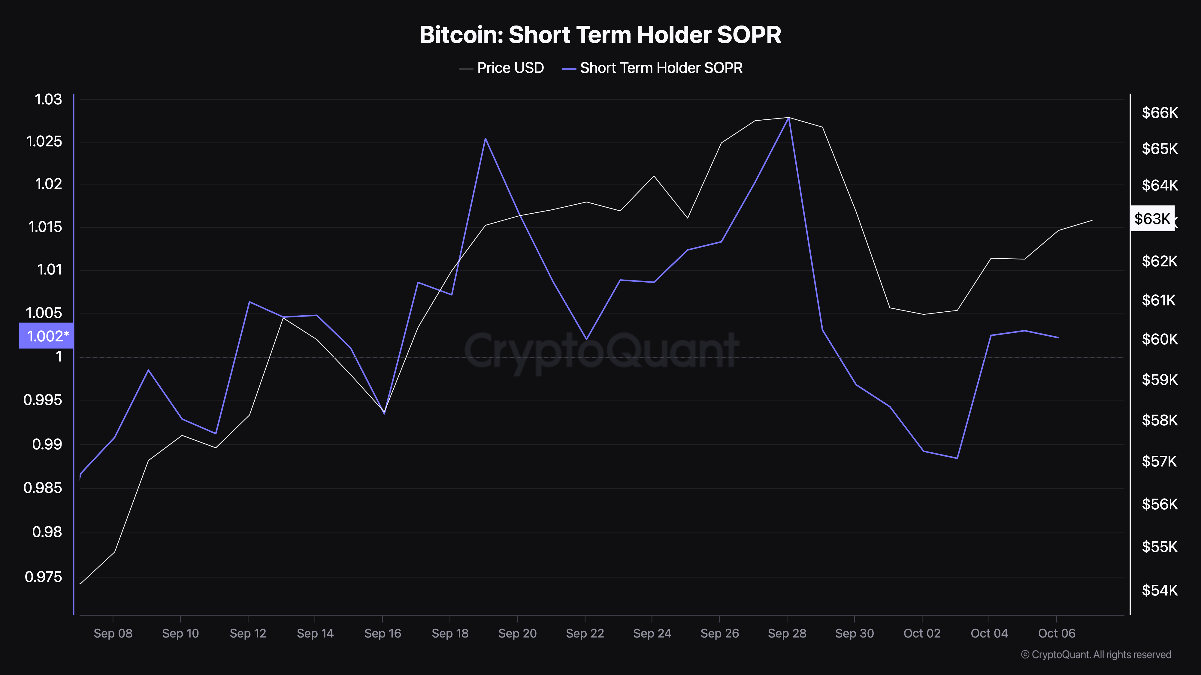 Ketika STH-SOPR berada di bawah angka 1, berarti para investor menjual dengan rugi. Sebaliknya, jika metrik ini di atas 1, berarti mereka menjual dengan profit. Adapun saat ini, rasio ini tepat berada di angka 1, maknanya adalah volume yang dijual dengan kerugian dan keuntungan seimbang.