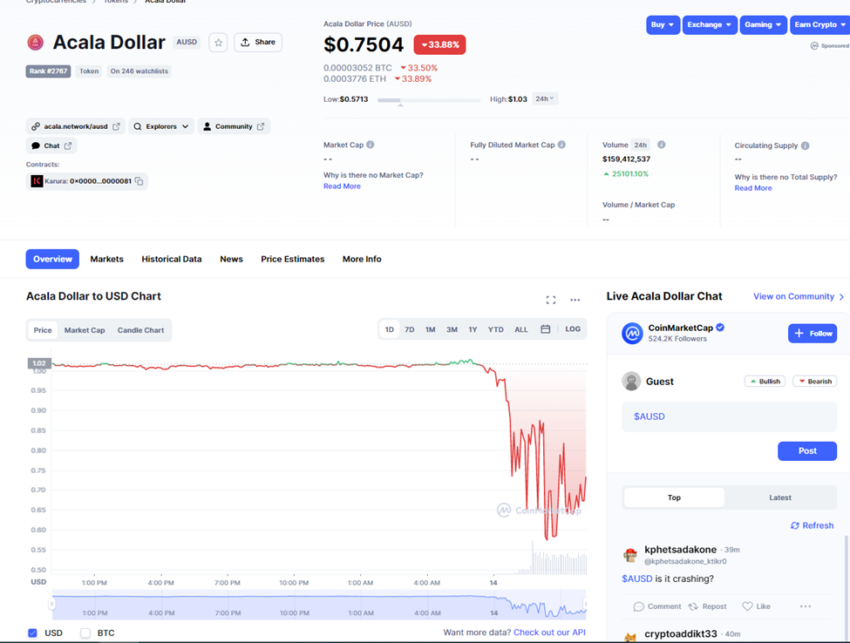 Pada saat penulisan, harga aUSD terpantau sudah menurun 33% selama 24 jam terakhir, bahkan sempat menyentuh kisaran US$0,54. Padahal, sebelumnya, harga stablecoin di ekosistem Polkadot ini sempat sedikit meningkat ke level US$1,02. Kini, aUSD diperdagangkan dengan harga sekitar US$0,75.