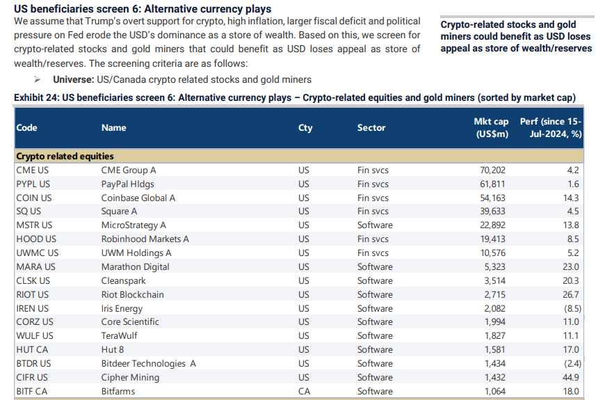 Bank investasi ini berasumsi bahwa dukungan publik Trump untuk kripto, tingginya inflasi, defisit fiskal yang parah, dan tekanan politik pada Federal Reserve bisa menjadi pertanda baik bagi saham terkait kripto. Dengan hasil seperti itu diharapkan dapat mengurangi dominasi dolar AS (USD) sebagai penyimpan kekayaan, bank ini mengidentifikasi ekuitas dan penambang emas yang siap mendapat keuntungan di kemudian hari.