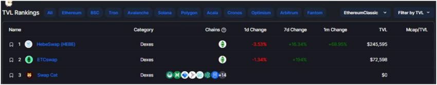 Decentralized exchange (DEX) HebeSwap, yang memiliki TVL terbanyak di Ethereum Classic, telah naik lebih dari 60% dalam sebulan terakhir.