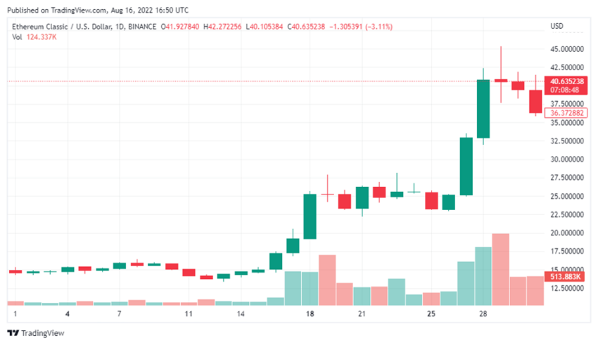 ETC mulai diperdagangkan pada level US$14,93 pada tanggal 1 Juli. Kemudian, berhasil mencapai titik tertinggi bulanannya di harga US$44,97; sebelum akhirnya menguji titik terendah bulanan di area US$13,48. Terakhir, ETC menutup bulan Juli dengan harga di kisaran US$36,45.