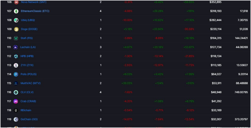 Selanjutnya, pada metrik terbaru, kita bisa menyaksikan bahwa terdapat beberapa chain yang mengalami kenaikan lebih unggul di antara yang lainnya. Di antaranya; yaitu Dogecoin, Lachain, Crab, Ubiq, dan Polis.