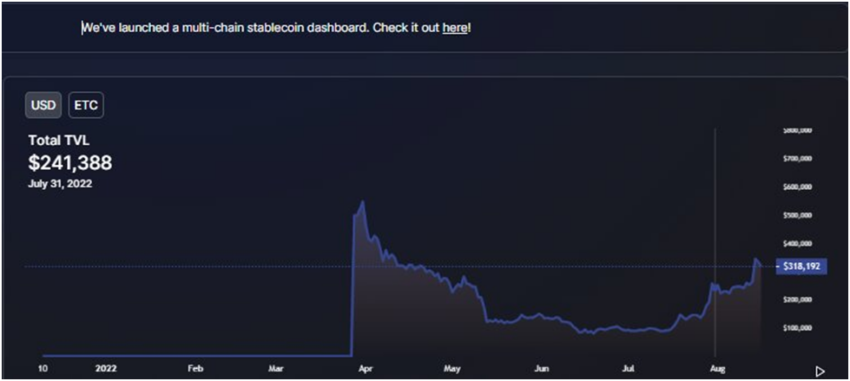 Pada bulan Juli lalu, nilai TVL blockchain ini meningkat sebesar 158%. Menurut Be[In]Crypto Research, berdasarkan data dari DeFiLlama, pada tanggal 1 Juli, TVL ETC berkisar di angka US$93.213. Setelah itu, nilainya melonjak tajam menjadi US$241.388 pada tanggal 31 Juli.