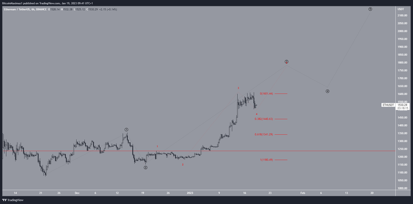 Di sisi lain, sub-wave count-nya menunjukkan warna merah, yang menandakan bahwa ETH tengah melakukan koreksi harga di dalam sub-gelombang empat. Kemungkinan besar, gelombang tersebut akan berakhir di level US$1.440, yaitu pada level retracement support Fib 0,382 (merah). Alasannya adalah karena gelombang tersebut seringkali bergerak dengan dangkal. Dan bila benar demikian, harga ETH bisa mencapai area tersebut dalam waktu 24 jam ke depan.