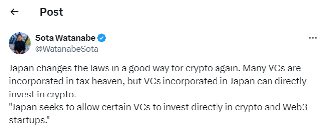 Pendiri Astar Network, Sota Watanabe, juga mengungkapkan kegembiraannya. Dalam utas X (Twitter), dirinya mengatakan bahwa Jepang kembali mengubah undang-undang dengan cara yang baik untuk kripto.