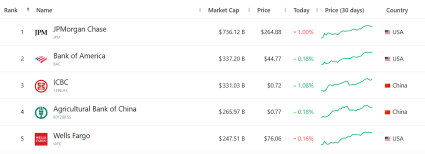 JPMorgan adalah bank terbesar di dunia. Per 20 Mei 2025, kapitalisasi pasarnya telah mencapai US$736 miliar. Sebagai perbandingan, kapitalisasi pasar Bank of America—yang berada di posisi kedua dalam daftar bank terbesar—hanya separuhnya, yakni US$337 miliar.