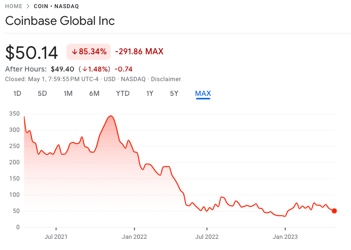 Harga saham Coinbase yang sempat oleng lantas naik kembali ke sekitar level saat awal go public pada November 2021, sering bull run market kripto dan harga Bitcoin yang mencatatkan harga tertinggi sepanjang masa (all-time high / ATH). Namun, crypto winter 2022 turun menghancurkan kinerja saham Coinbase.