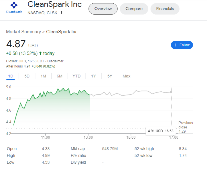 Selama kuartal kedua tahun ini, CleanSpark mengeklaim telah menambang sebanyak 1.624 bitcoin. Fakta tersebut mendapat respon positif dari pasar dan langsung menerbangkan saham perusahaan hingga 13,52% pada perdagangan hari ini (4/7).