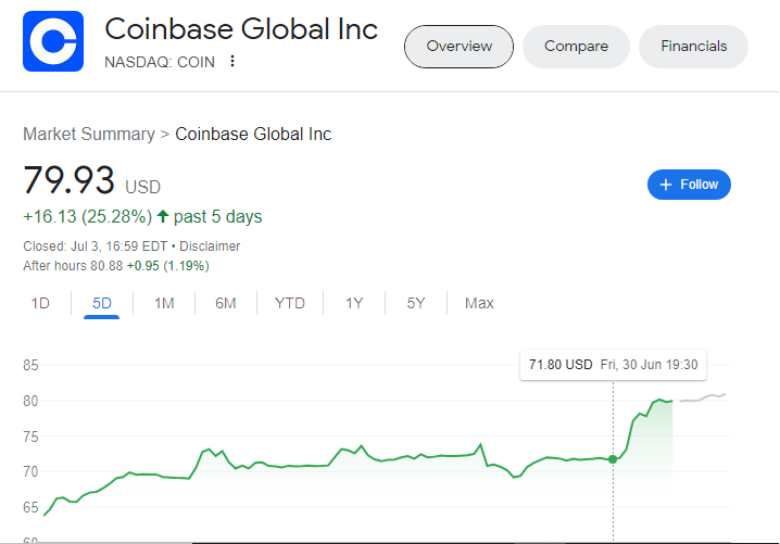 Mulai akhir Juni kemarin sampai perdagangan hari ini, harga saham Coinbase Global (COIN) di Nasdaq terus menunjukkan tren yang menanjak. Bahkan, jika dilihat selama 5 hari ke belakang, saham crypto exchange populer di Amerika Serikat itu sudah terkerek sebanyak 25,28% ke level US$79,93 per saham.
